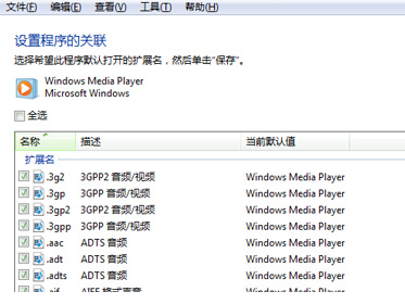 3.咱们在左侧窗口中选中windows Media player软件,然后在右侧窗口中单击“将此程序设置为默认值”,之后便会弹出下面的设置程序的关联的窗口了,咱们选择其中需要修改后缀的影音文件,然后点击保存即可。